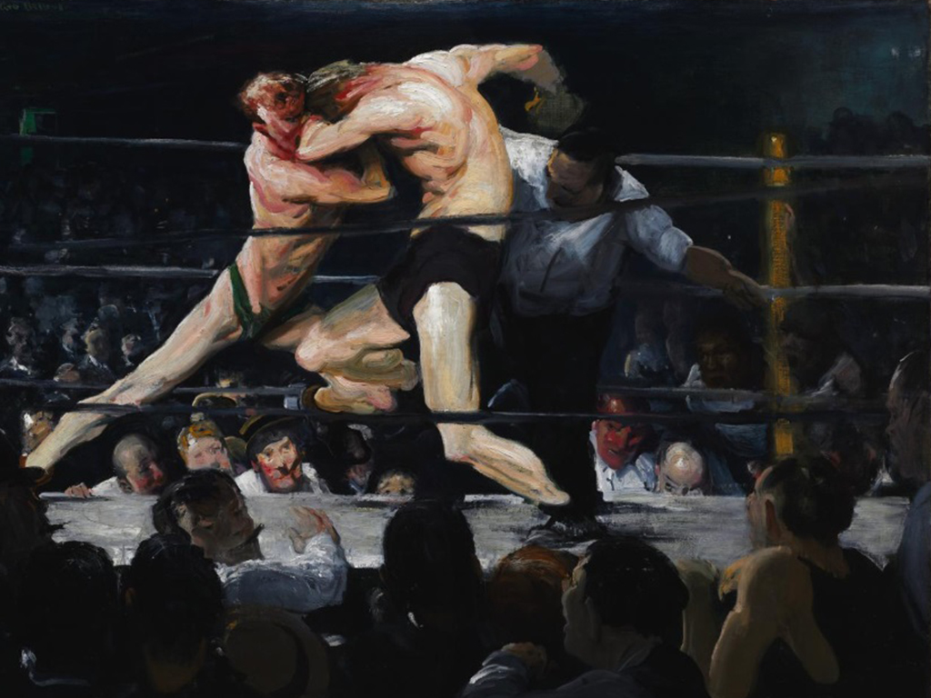 Artist George Wesley Bellows picked a low point of view when he painted “Stag Night at Sharkey’s” in 1909 so the viewer would feel like a spectator at this boxing match with two boxers fighting at a private athletic club across from his studio. Although the club was private, outsiders, or stags, would be allowed to view a fight or even participate in one.
