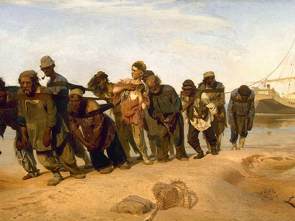 Ilya Repin painted “Barge Haulers on the Volga” in 1873, which shows the hardship of forced labor. In the painting, all the men looked defeated, except for a young man who appears to be pulling against his binds in defiance.