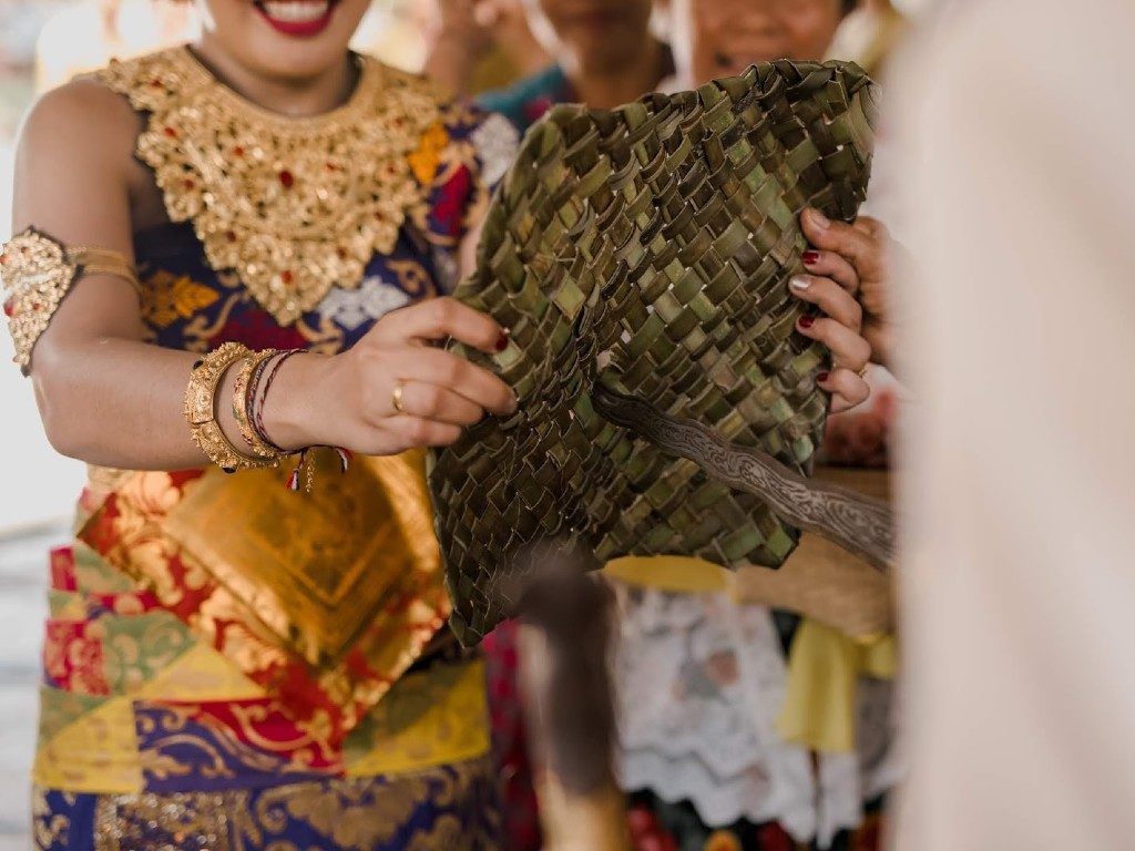 Both the bride and groom carry knives for different parts of a Balinese ceremony. At one point, the groom will plunge his dagger, known as a kris, into a woven mat. Though some sources say this signifies that the bride is ready to settle down, others say it represents her deflowering. Either way, the pandanus mat will never be the same.