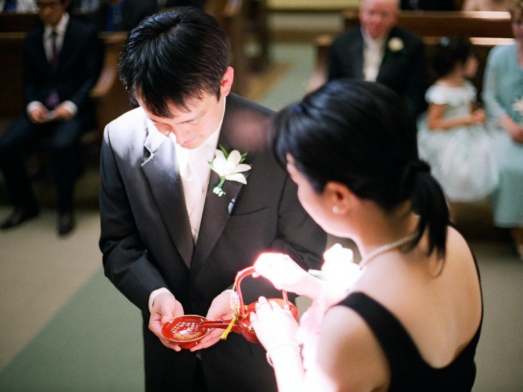 During a Japanese ceremony a couple might drink – you guessed it – sake. The tradition is known as san san kudo. There are special san san kudo serving sets from which to serve the sake. The sets have three cups, one symbolizing heaven, one symbolizing earth, and one symbolizing humankind. The bride and groom each take three sips from each, for a total of nine, since nine is a lucky number.