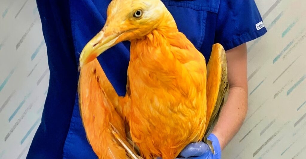 Everyone was astounded by the bird’s strange, beautiful color – it looked like the phoenix of myth. The bird appeared to have trouble flying, so an excited good samaritan picked it up and called Tiggywinkles Wildlife Hospital.