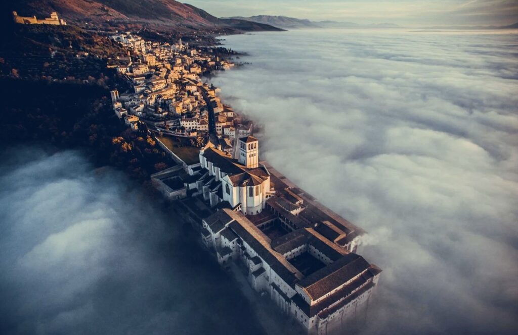 In what appears to be a castle, this view can be seen in Umbria, Italy, but only by drone. And it is not really a castle but a church known as the Basilica of St. Francis of Assisi. The construction of the giant basilica began in 1228.