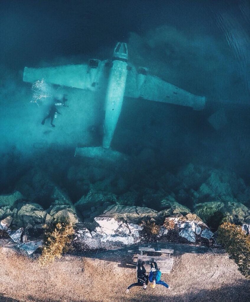 Above Morrison’s Quarry in Chelsea, Quebec, a drone captured an impressive image of a sunk aircraft. Even though the quarry is only 25 minutes from Ottawa, it is like flying to a tropical destination.