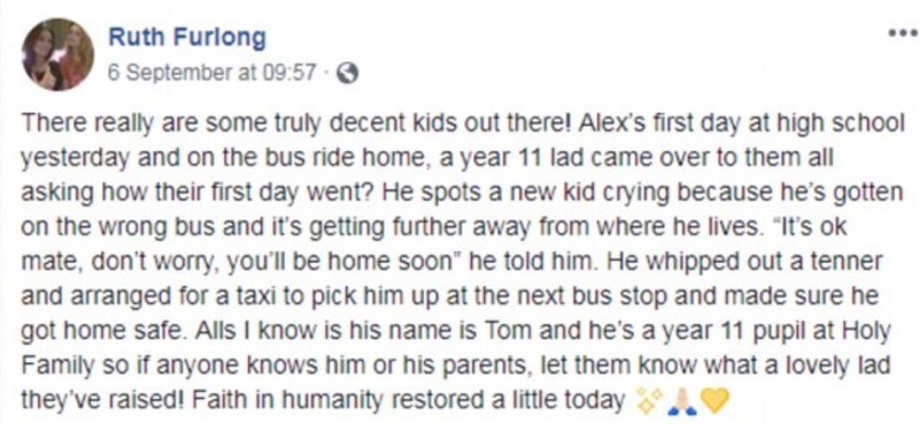 It wasn’t long before the story spread on social media like wildfire. Harry Campbell’s mother, Colette, wrote: ‘Harry had told Dylan to ring the taxi to pick him up… to make sure he got home safe… God love him, this little fella was upset and had got on the wrong bus and with it being his first day wouldn’t have known very many people either.”