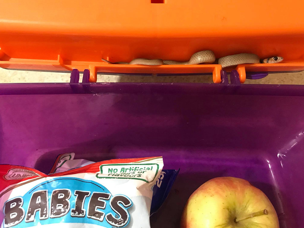 This poor kid in Australia probably asked his mom to put something interesting in his lunch box. Well, he got his wish. There was a venomous snake lurking inside just waiting to ask how his school day was going.