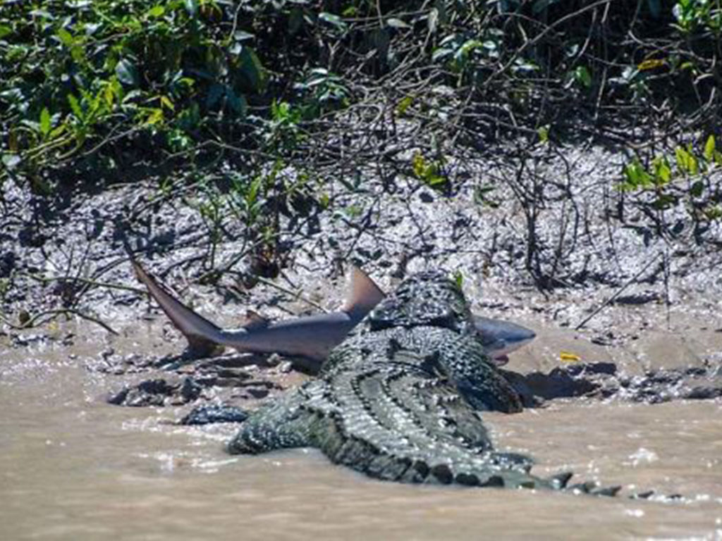 How did the shark get in a swamp? It’s actually the Adelaide River in Kakadu National Park, and it’s a salt water river. But still, it’s not uncommon to find a massive crocodile eating a bull shark.