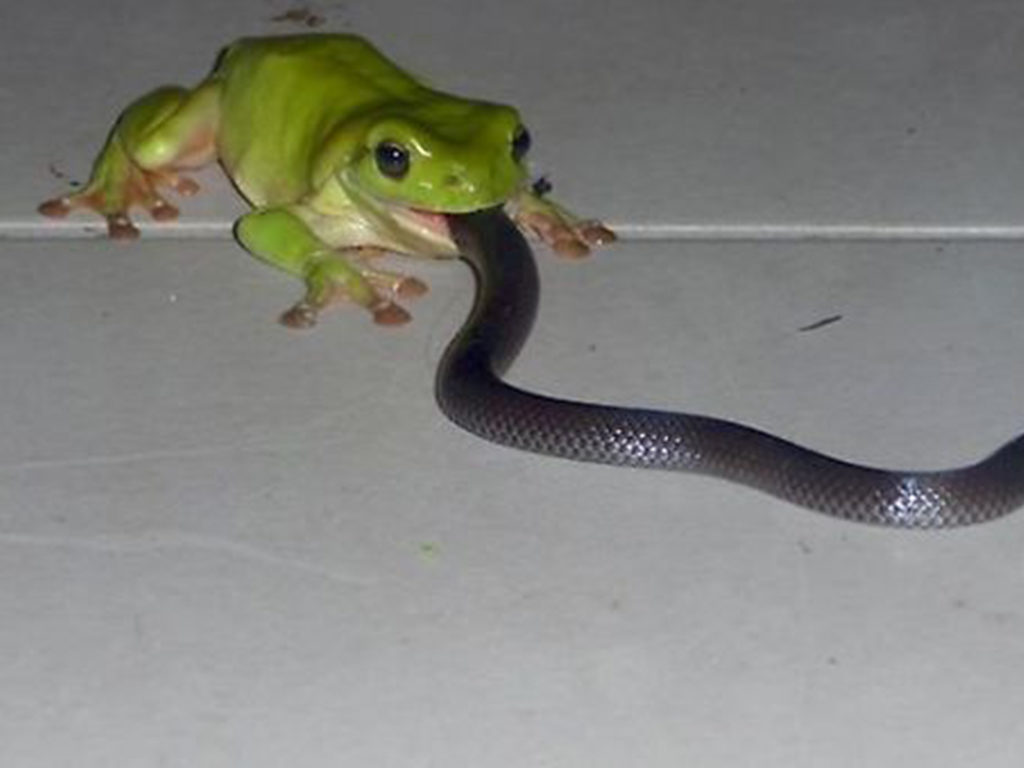 In Australia, anything can happen and that includes a frog eating a snake and not the other way around. But supposedly, tree frogs don’t usually eat snakes, so was someone fooling around with Photoshop?
