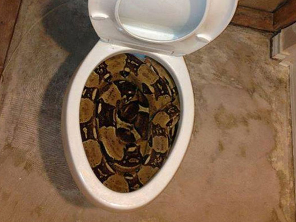 Imagine you’re about to take a seat on this toilet and don’t realize there’s a python coiled in the bowl. Fortunately, pythons are constrictors and not venomous biters. Whoever lives here probably needed to call a snake catcher to get this thing out of there.