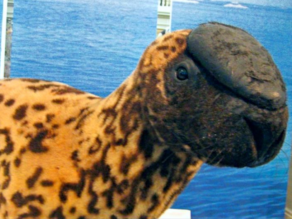 Male hooded seals are commonly found in the North Atlantic Ocean and have an inflatable hood on top of their head that grows when they turn 4 years old. They are successful divers and can swim as deep as 1,000 meters. They stick mostly to marine prey like flounder, polar cod and squid. But they are very aggressive, especially the females of the species when they are protecting their young.