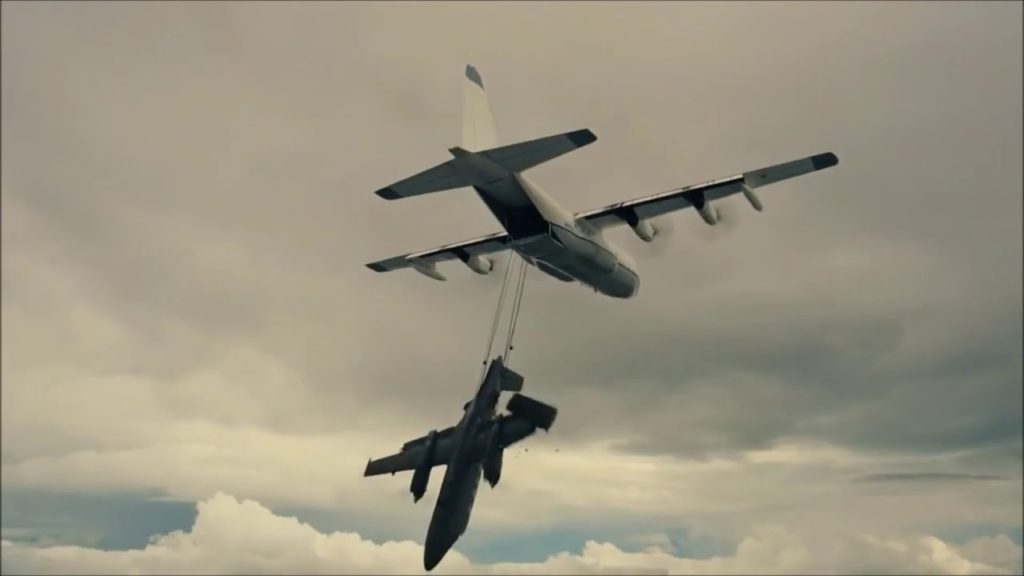 The final Batman movie of Christopher Nolan, features a plane hijacking where real stuntmen jump from one plane to another. The real action is where the fuselage snaps in two and is attached to the other plane with a cable.