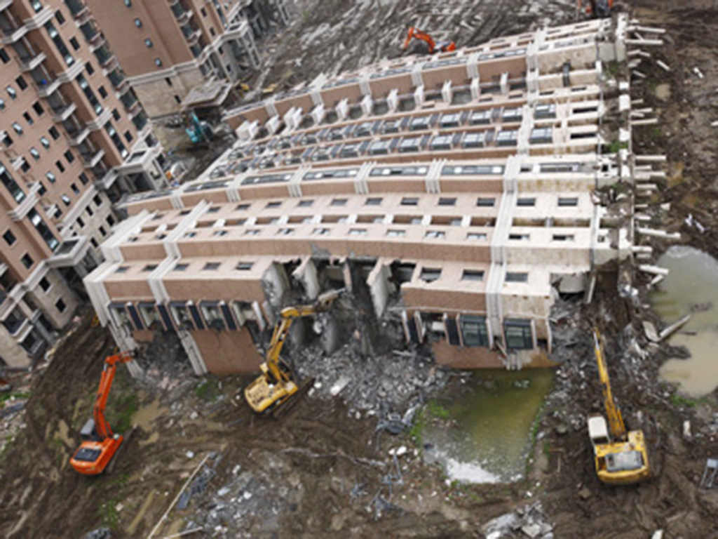 On the morning of June 27, 2009, one of eleven buildings in the Lotus Riverside complex in Shanghai, China, collapsed without warning. Investigators determined that the collapse was the result of the 13-story building being built against a mound that was 10 meters high on one side, and an underground parking lot 4.6 meters deep on the other side.