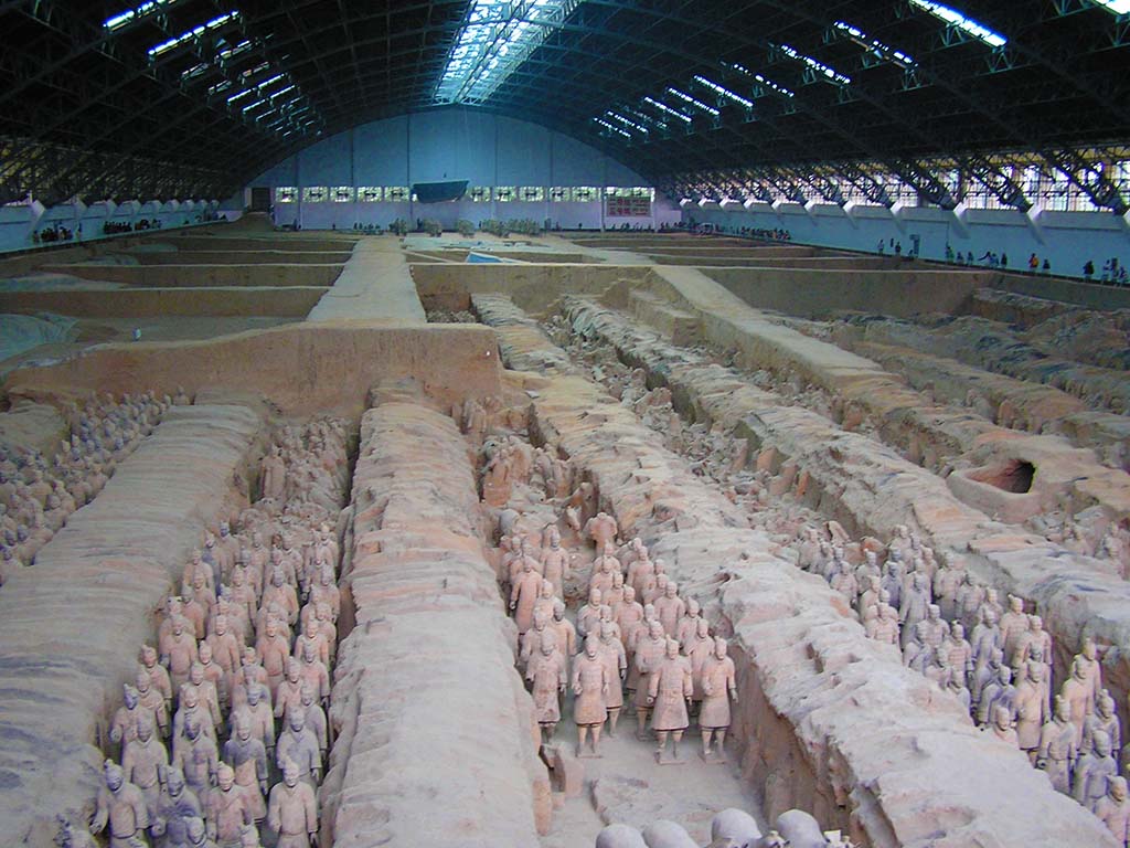 The Tomb of Qin Shi Huang has a statue army of approximately 8,000 soldiers, plus 520 horses with chariots and 150 calvary horses. Research suggests that the army was buried with the emperor around 210-209 BCE.