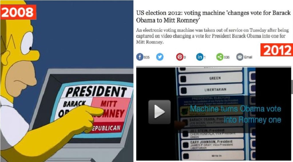 Reality: Just 4 years later, Pennsylvania voters saw a voting machine changing their votes for Barack Obama in favor of his rival Mitt Romney. That’s more than prediction!