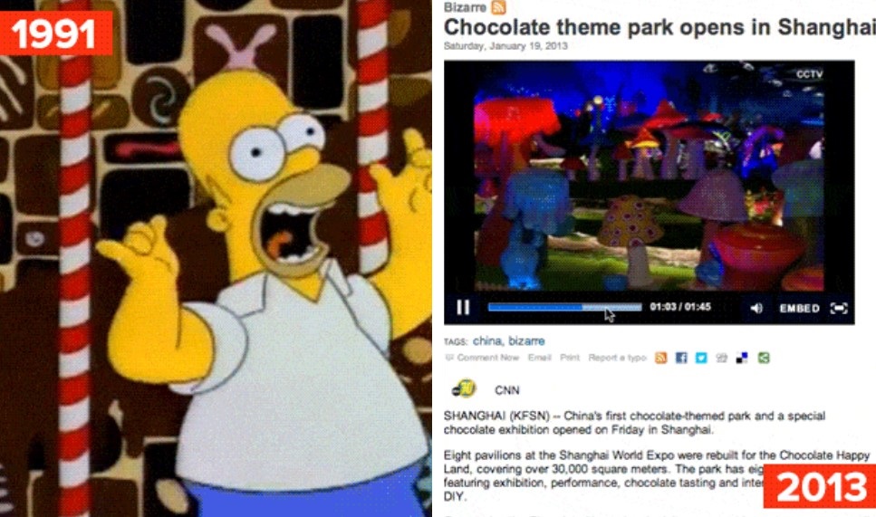 “The Simpsons” Bizarre Predictions That Actually Happened Years LaterBy Tammy Salt / September 16, 2019 19. Chocolate Everywhere! imgur.com The Show: Homer was in an interview which he fails because he was daydreaming of a Land of Chocolate. Reality: In 2013, Shanghai opened the Chocolate Happy Land and it was just like Homer dreamed of! Pages: 1 2 3 4 5 6 7 8 9 10 11 12 13 14 15 16 17 18 19 20 21 22