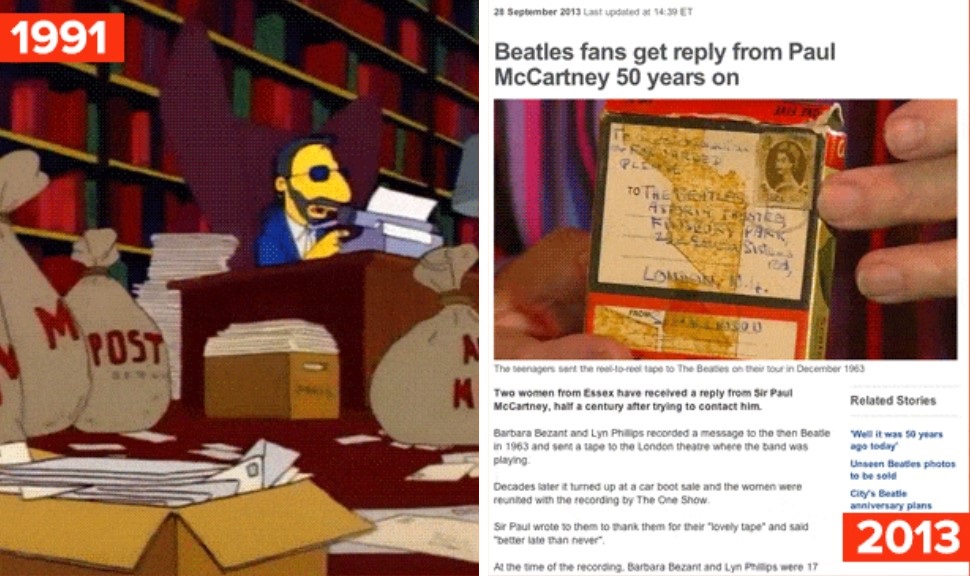 Reality: In September 2013, two Beatles fans have finally received a reply from Paul McCartney after sending him a letter and recording. You see, they wrote to the band 50 years ago and have finally received an answer. Actually, the fan mail never got to McCartney because it was sent to a London theatre where the band was supposed to sing. Somehow it was lost and found decades later. At the BBC’s “The One Show,” the fans received their letter and a reply from McCartney!