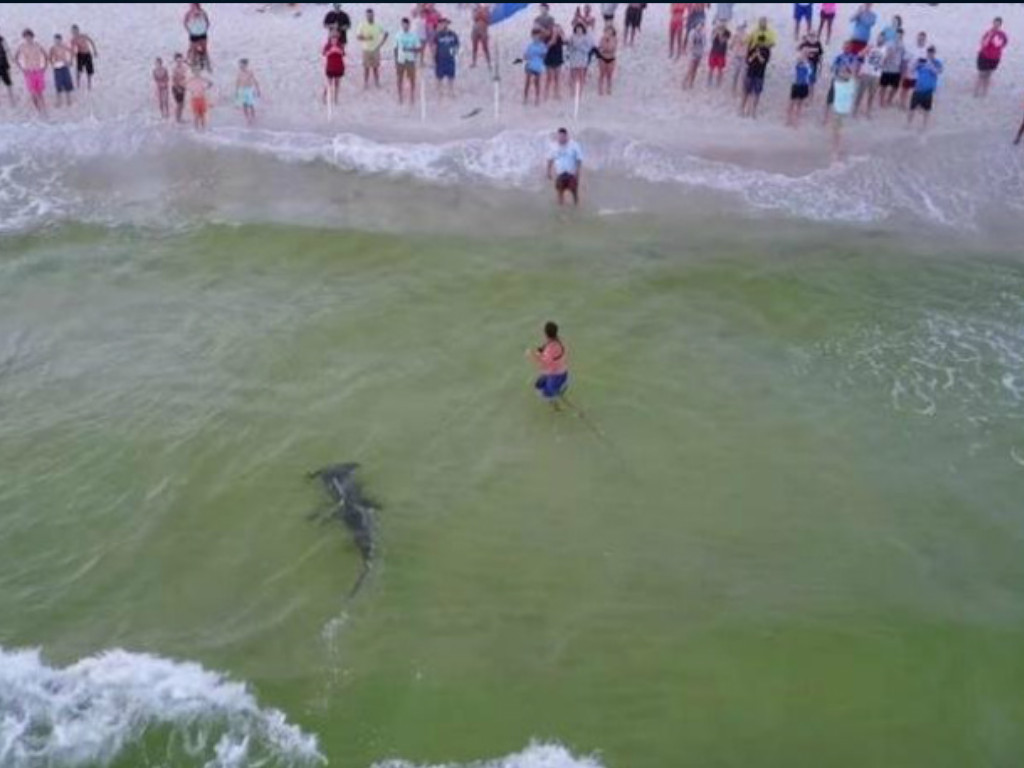 There’s a hammerhead shark in the water, and that woman doesn’t realize just how much danger she’s in. But everyone else seems to have noticed the shark as they’re all watching nervously from the sandy shore.