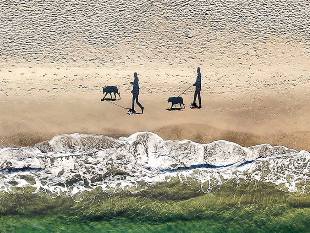 A drone captured an image of what appears to be four shadows—two humans and two dogs—walking along the sandy shores in Black Sea Beach, Bulgaria. Were the shadows cast by people walking high above on a cliff or was there something other worldly happening here?