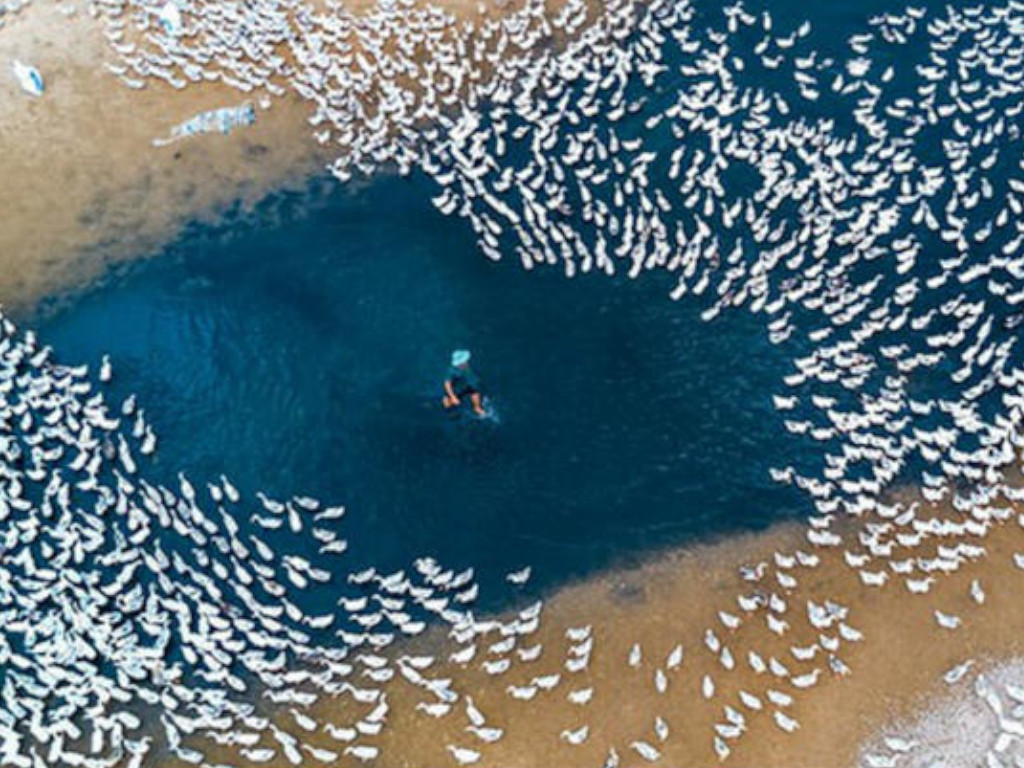 Some people go to parks to feed pigeons but this fisherman in Tuy Hoa, Vietnam, is busy feeding an entire horde of ducks. But from an aerial point of view, it looks like this swarm of ducks has surrounded the man and are about to attack.