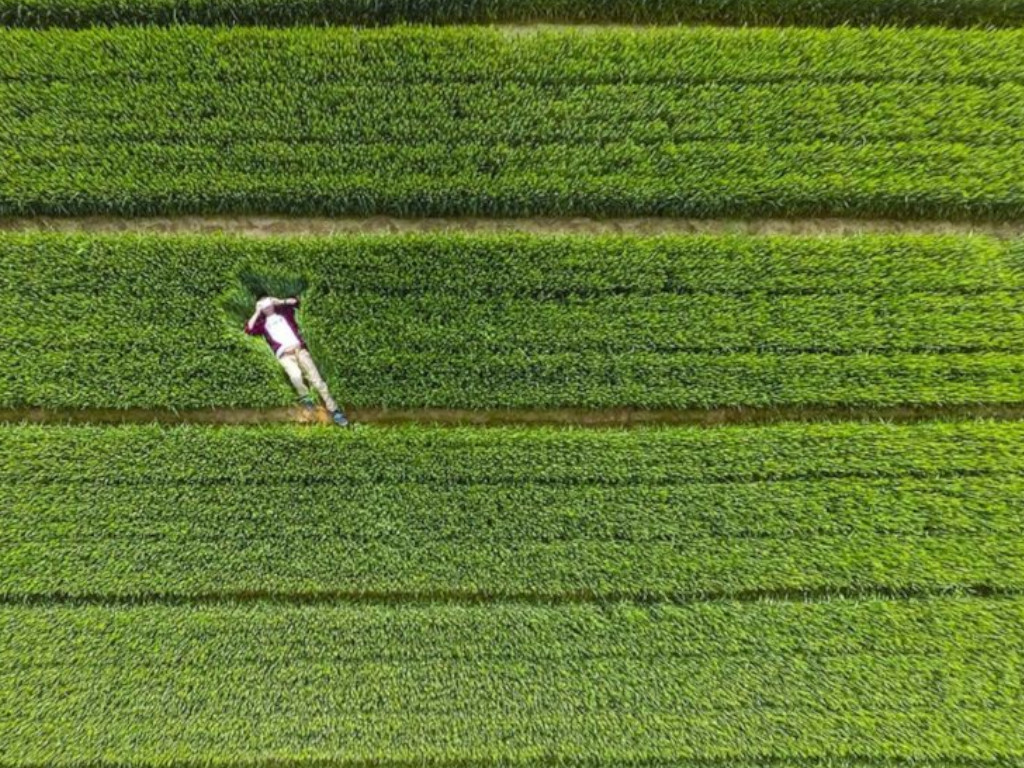 This aerial shot was snapped in China, and hopefully, this guy is a passerby or the owner of the property and not the person hired to mow the lawn. Otherwise, he might lose his job for napping on the grass.