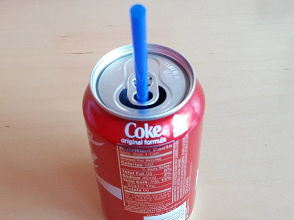 Putting a straw in a soda can can be difficult because the fizzy bubbles caused by carbonation at the bottom of the can can send the straw floating back up to the top of your drink. To keep the straw in place, put it through the hole in the tab of your drink and voila, it’ll stay put.
