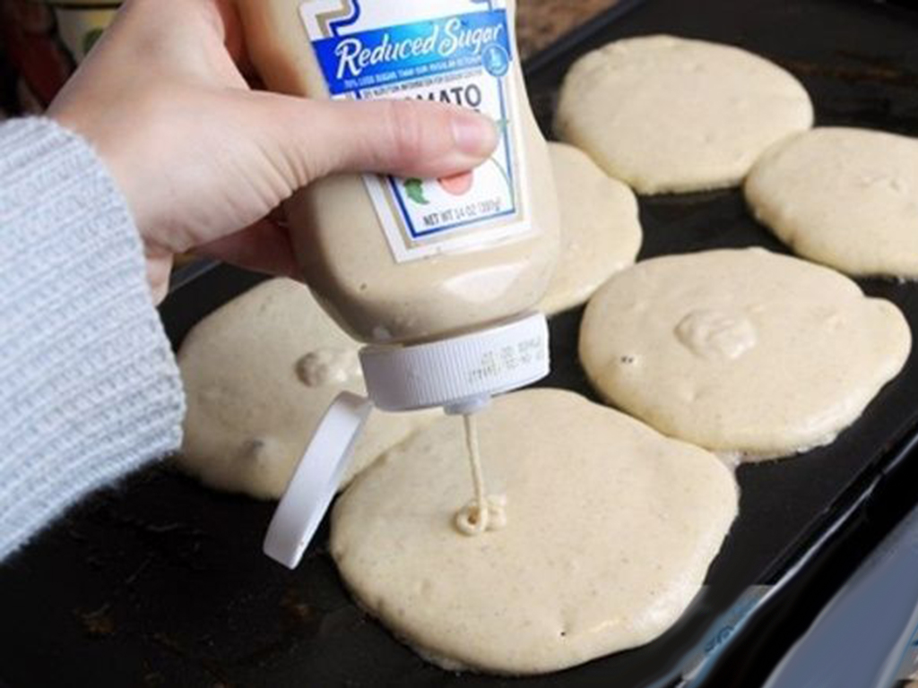 If you’ve got an empty ketchup bottle, don’t just throw it away. You can use it to fill with pancake batter, making it easy to pour just the right amount onto your skillet. Best of all, if you have any leftover batter you can keep it in the fridge for later just by closing the lid.