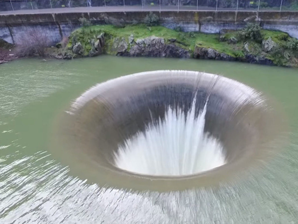 The water drops 200 feet straight down into the pipe, which is about 28 feet in diameter at the bottom. Then the pipe takes a 90-degree turn and continues hundreds of feet to the other side of the dam where it spills into the creek and eventually flows to the Yolo Bypass. And there’s a reason boats have nothing to worry about.
