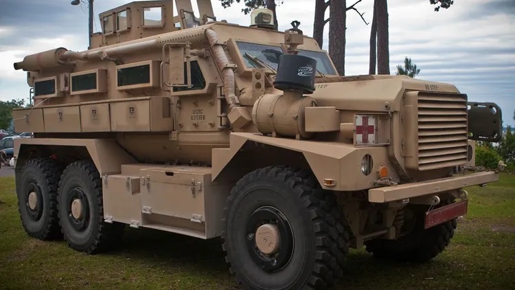 This is the Cougar MRAP. It’s a mine-resistant, ambush-protected earth vehicle designed to resist everything and anything. It comes with a C-7 diesel engine carrying 350 horsepower.