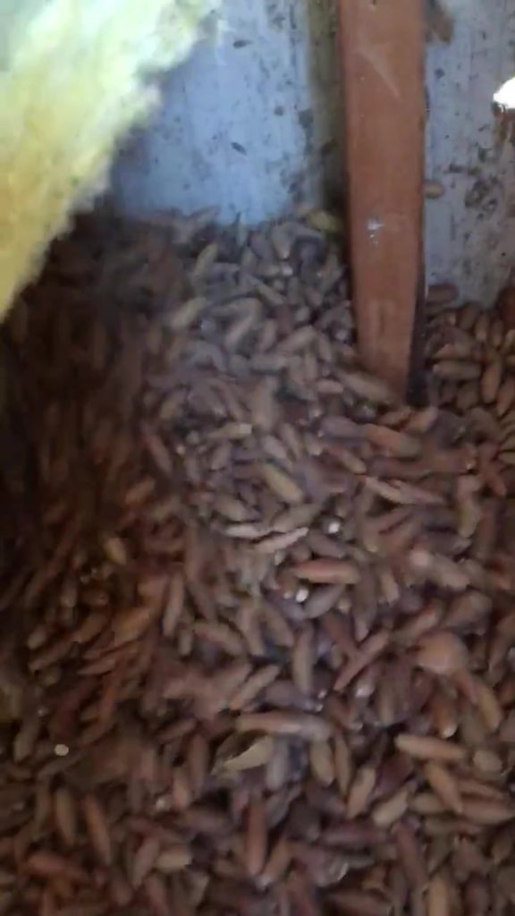There’s a brief pause as the nuts form a blockage but Von Thaden just keeps working. After a few moments, the nuts are dislodged and start to pour out onto the floor. Von Thaden just keeps working as more and more nuts continue to fall out.
