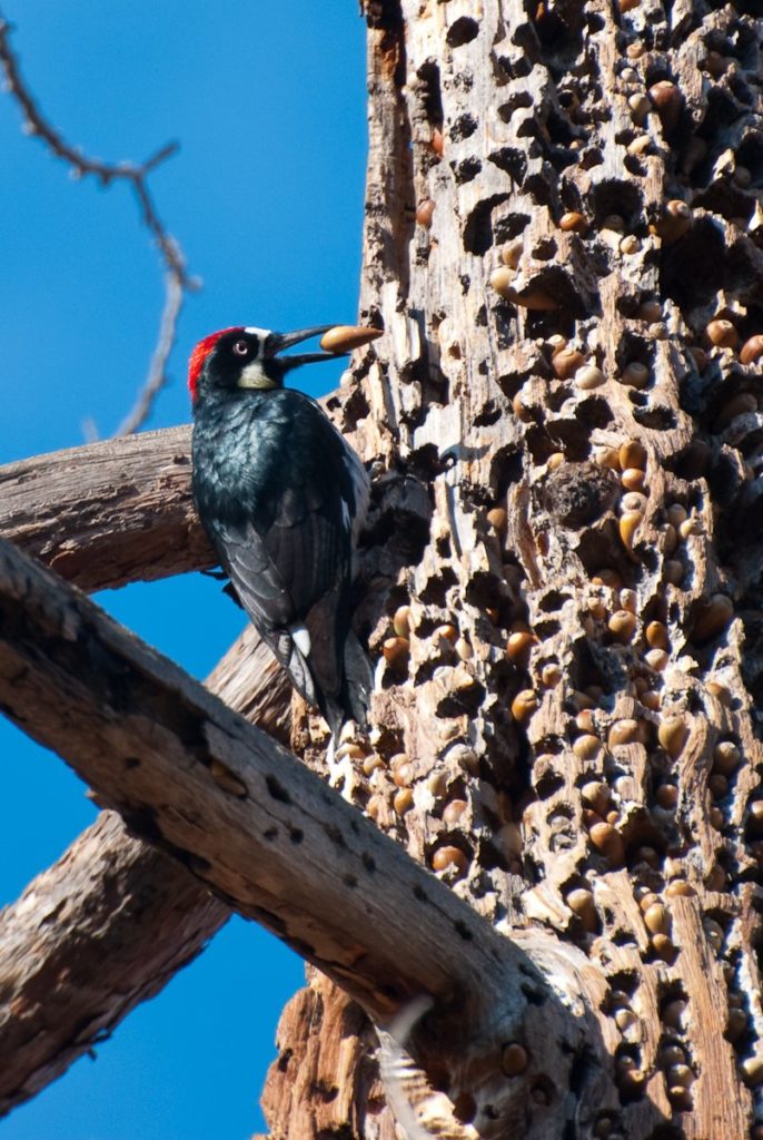 In the wild, acorn woodpeckers bore holes into trees. Once they have bored the holes, they store acorns inside them for the future. These trees become what are known as “granary trees.” A single granary tree can contain thousands of nuts.