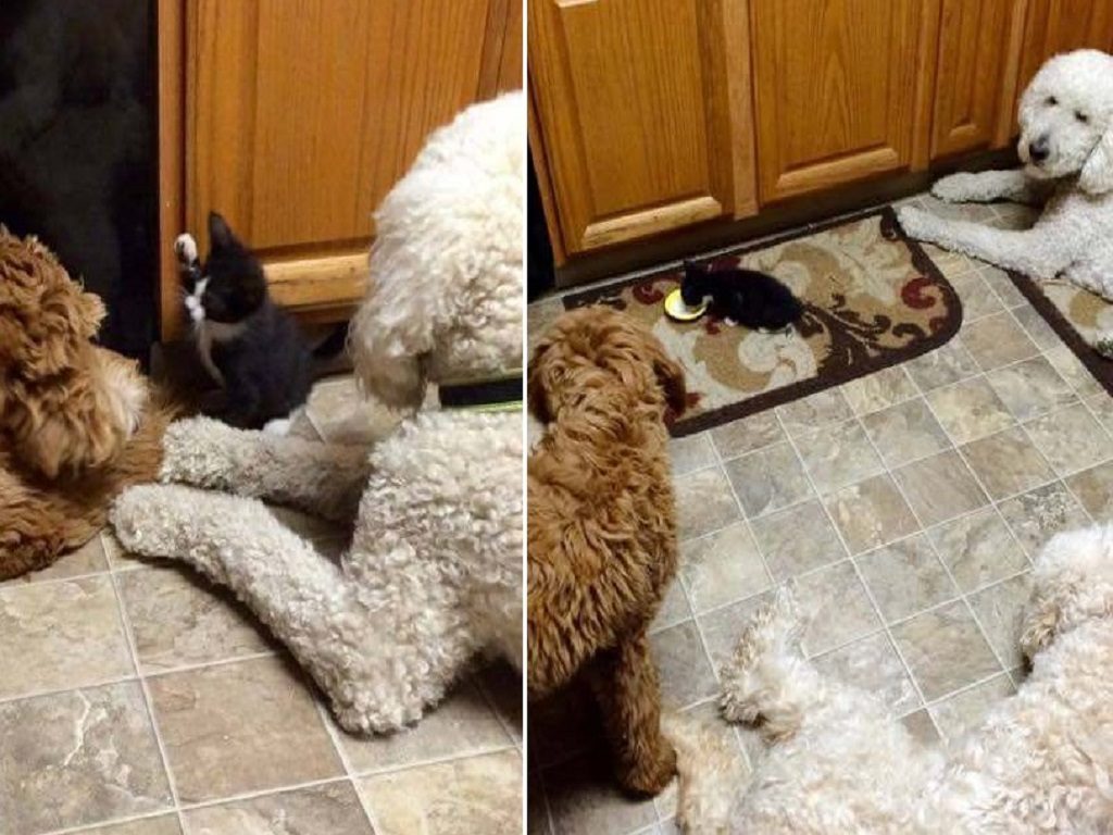 “Our mama dog was very close to delivering her pups at that time and took the kitten in without hesitation!” said Myers. That time, the kitty (that was named Widgie) also ate some food, as he was about two weeks old, but suddenly found out he was the baby of a pregnant mom – because she didn’t let him stray away from her!