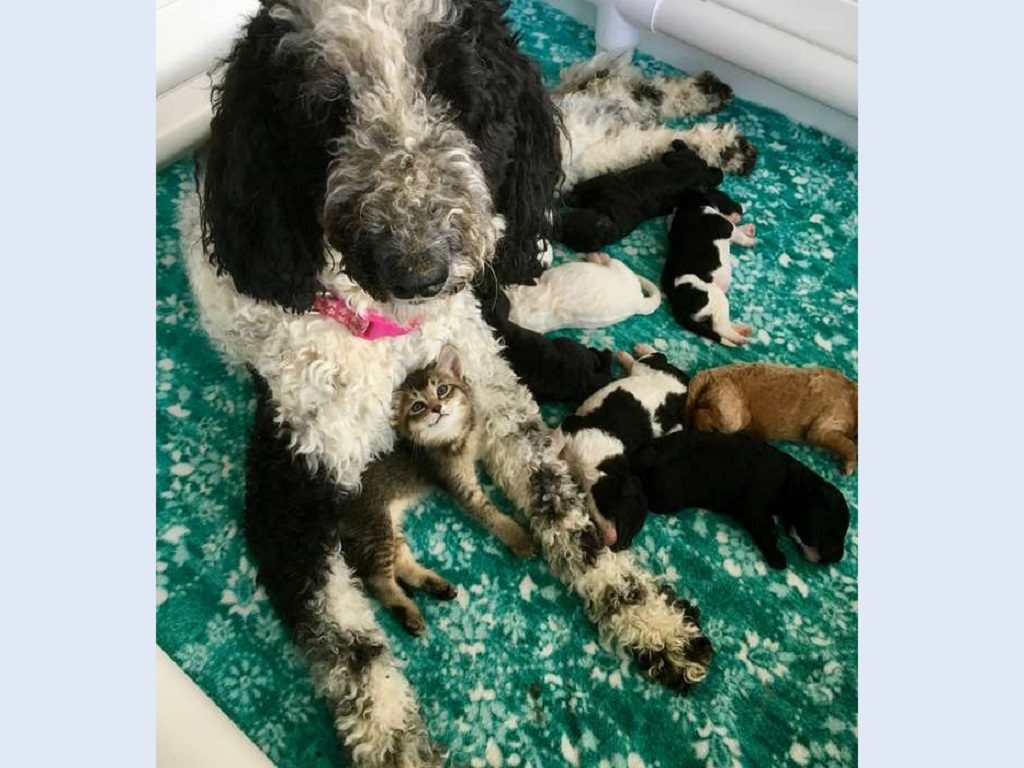 Maybe they’re not the same species or don’t look alike, but the dog mommy, named Izzy was a perfect mom for Nala! Myers became a foster parent again for the dog and her litter. Izzy had quite a lot of puppies, but she adopted the small kitten.