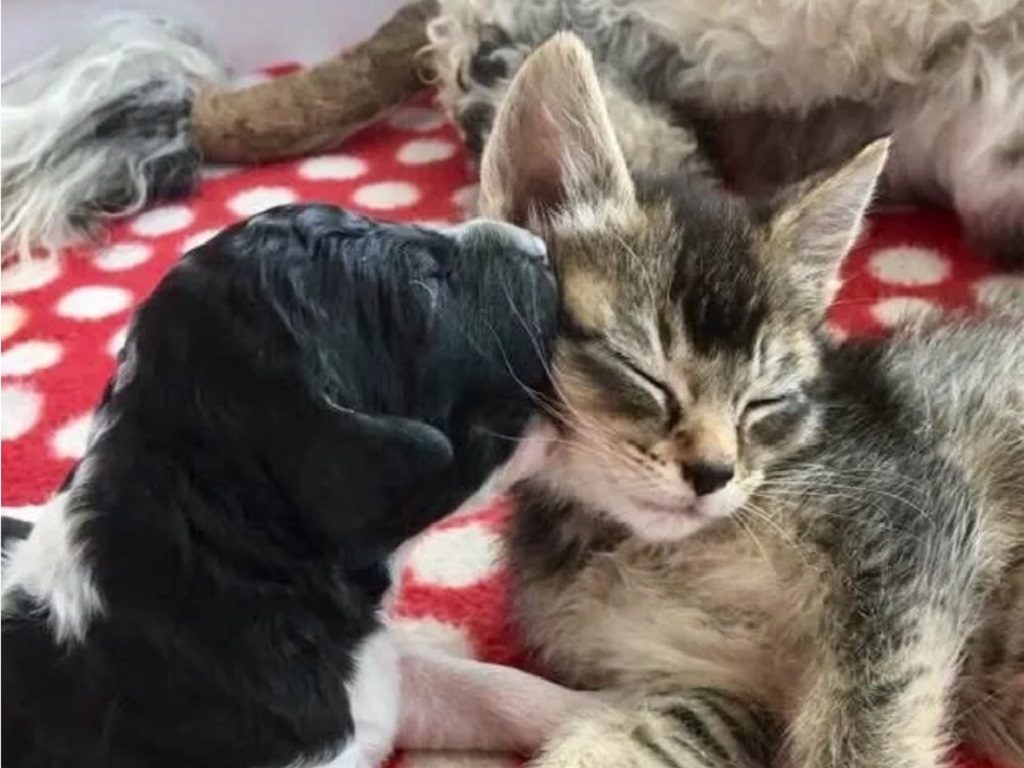 At first Nala was allowed to walk around the house, but seeing that Izzy kept jumping from her pen to pick up Nala and add her to her litter, it was apparent the kitty belonged together with the puppies and the loving mom. Myers knew that Nala was in good paws and was the lucky person to have been able to shot these next adorable photos…