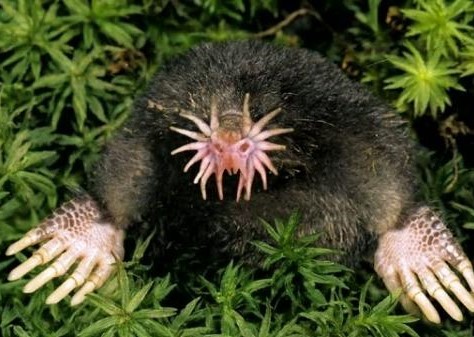 This scary-looking animal is called the star-nosed mole, hence its pink appendage-like structures around the nose. There are twenty-two of them, and they are called Elmer’s organs. They are able to pick up smells, vibrations, temperature changes, and touch. Star-nosed moles live in the northern regions of North America and prefer wet, low areas as well as lakes and ponds where they go to find food.