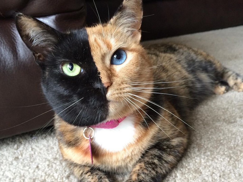 This beautiful two-faced cat is called Venus. She is also an Instagram star, and she’s sharing her fame with her three cat siblings and a Shiba Inu dog sister. Venus is ten years old!