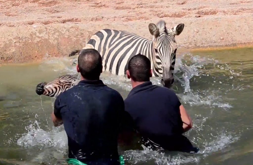 At first, La Nina did not like that these people touched her baby. So she packed some strength and slowly got into the water. Her instinct told her she should save her baby from the water and from the two humans. But then, she understands what the zookeepers were doing and calms down…
