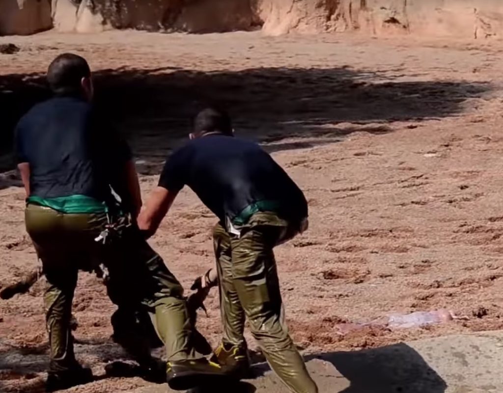 A few seconds later, the men carried the baby out of the water and carefully laid him on the sand. As soon as they save it, they had to get back fast and let the two zebras reunite. The mom immediately hopped out of the water and came close…
