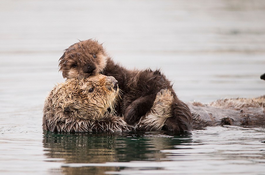 Thanks to nature photographer Suzi Eszterhas, we got to see a loving mother otter lifting her pup on her belly to keep him warm above the water. After a nap, she decides it’s time for the first lesson…