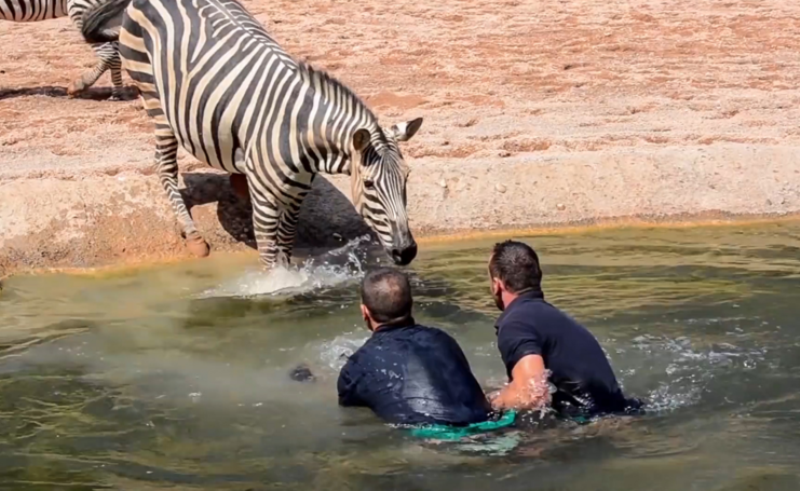 The baby zebra was trying to keep its head to the surface – he learned that the hard way! Then, the men approach him, trying to catch him. In just a few seconds, they get close to the baby, while still keeping an eye on the protective mom. Then, they catch the baby and the mom reacts in the most amazing way!