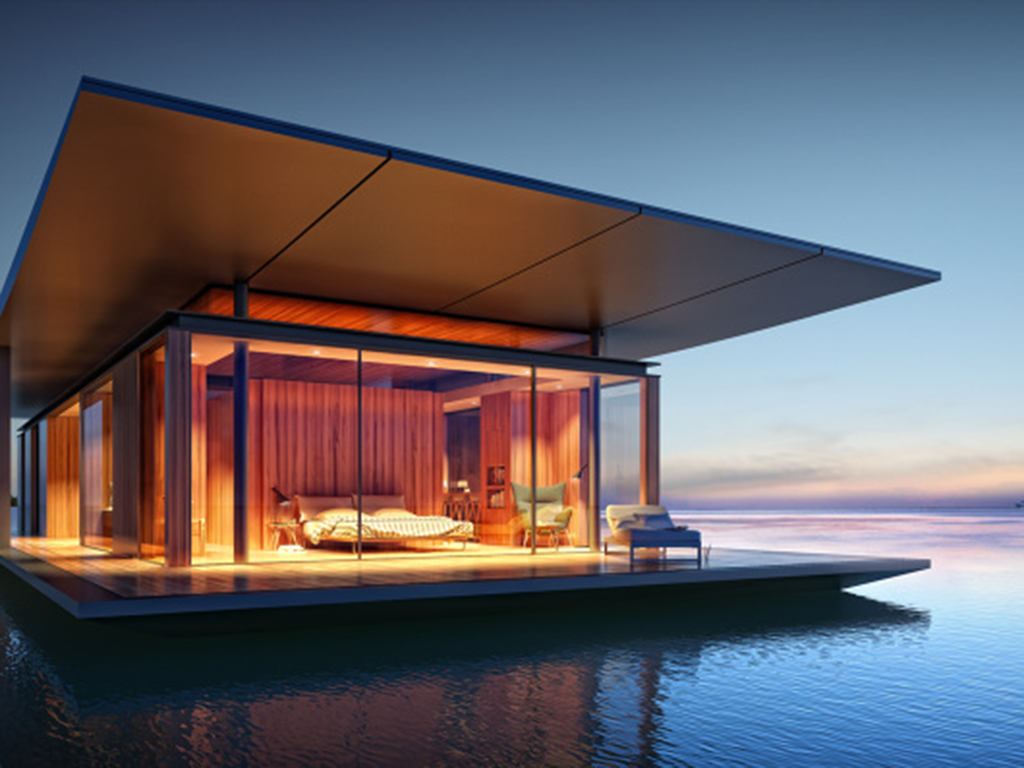 The epitome of minimalism, the floating house was designed by the architect team Dymitr Malcew. Featuring windows on every side, you can feel like you’re out at sea without feeling sea sick. There’s also little need for artificial lighting during the day, so electric costs stay low.