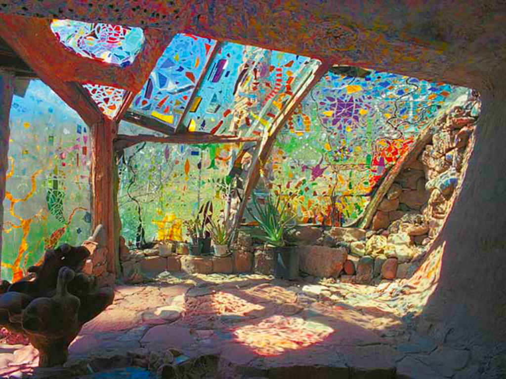 Made out of adobe, wood, stone, ferro-cement and glass, Eliphante is the creation of artist Michael Kahn. Built in the ‘70s, the cavern-like house is decorated with spectacular colors and its foundation works natural elements, such as boulders and trees, into the design of the house. Its interior is completely technicolor because of the use of stained glass.