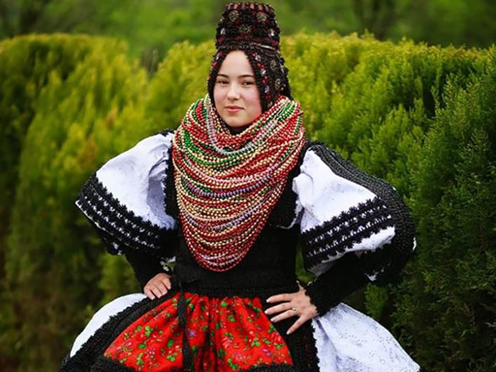 Weddings in the northwest part of Transylvania known as Oas include wedding dresses such as this striking little number. There aren’t a lot of brides who can say they wore dozens of beaded necklaces and leather boots on their big day and totally owned it!