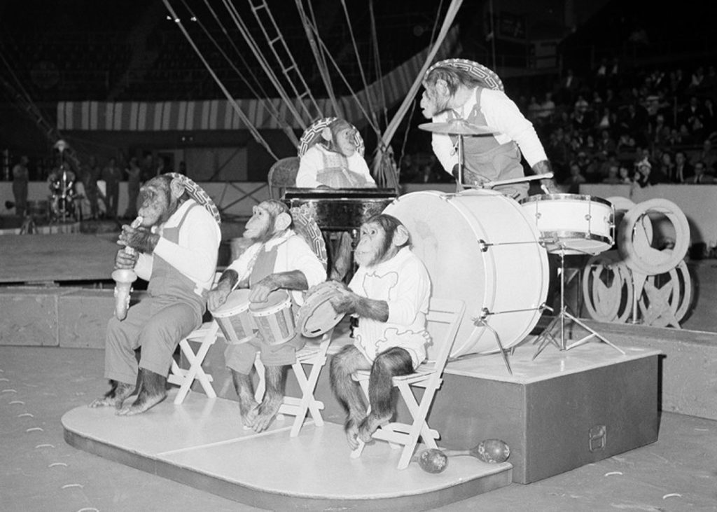 Add monkeys to the list of performing animals. This group of chimpanzees was trained as a band. Here, they perform in Madison Square Garden. They performed as a part of Ringling Brothers, Barnum and Bailey Circus.