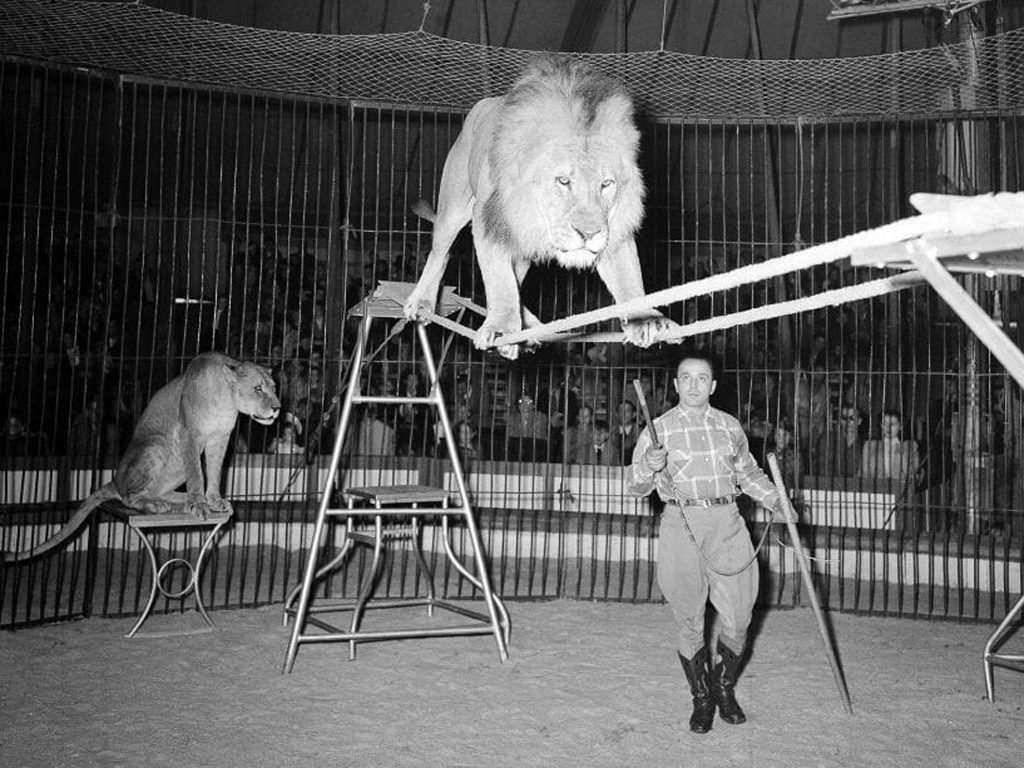 Lion tamers trained their lions to do all kinds of tricks. In this photo, trainer Michel Van Been guides Prince. The 6-year-old lion was one of the main attractions of the circus. As you watch him balancing on this rope, it’s easy to see why.