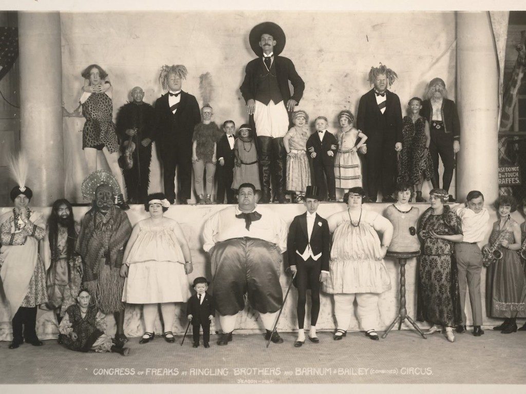 Note the caption at the bottom – “Congress of Freaks.” Taken in 1924, this photo captures the group of sideshow acts from the Ringling Brothers and Barnum & Baily Circus. In this one picture, you can see the variety of people. Short, tall, fat, thin, hairy, contortionists – the circus collected them all.