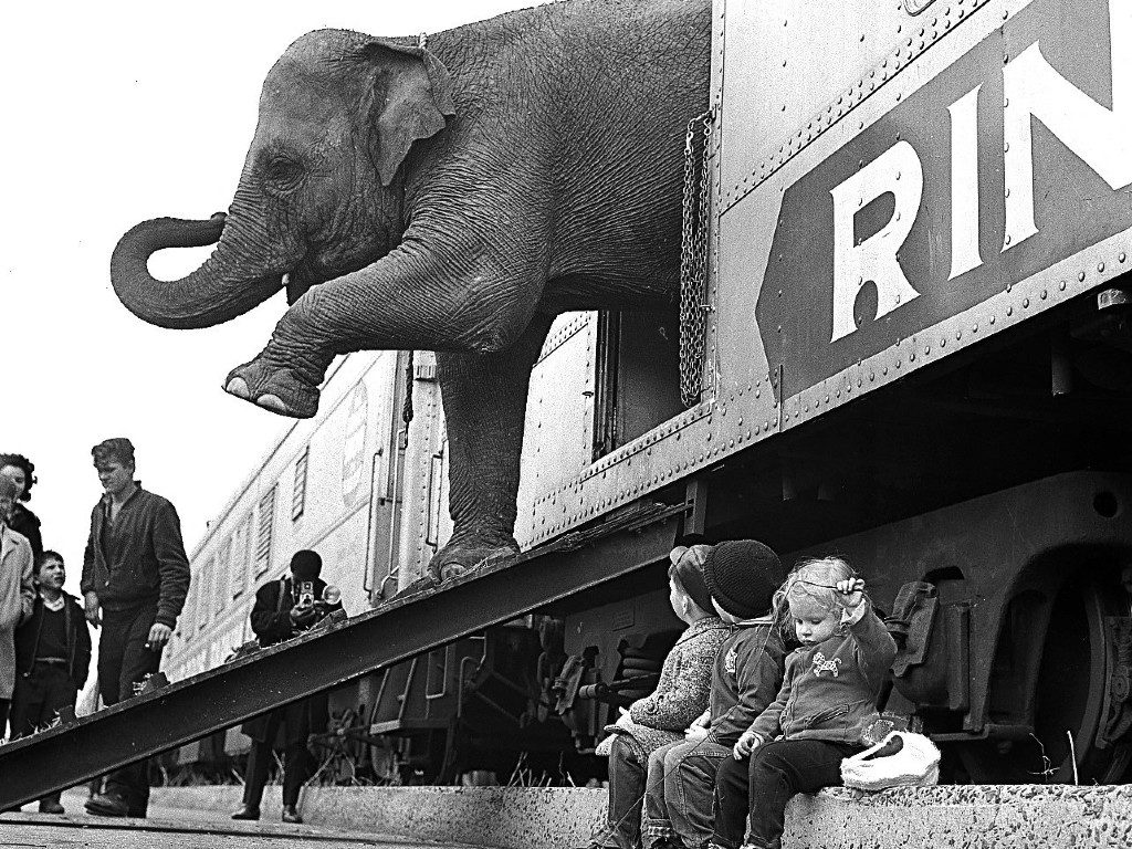 Before mounting pressure to remove elephants from the circus, however, elephants were one of the main attractions. This elephant steps off a train belonging to the Ringling Brothers. It’s hard to imagine today that children would be allowed to nonchalantly sit so close.