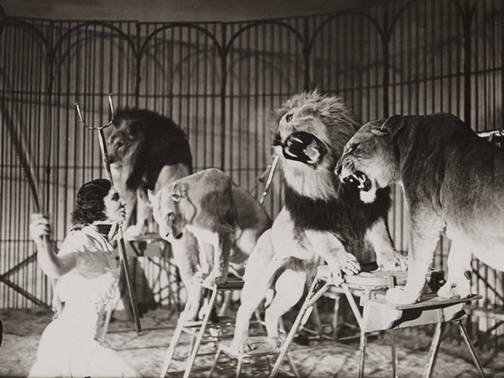 Taken in Ascot, UK by Edward G Malindine in 1936, this photo shows a lion tamer for the Bertram Mills Touring Circus trying to convince her lions to play nice. It’s hard to be sure whether or not she wants them to roar ferociously at her, but this kind of behavior could go awry very easily.