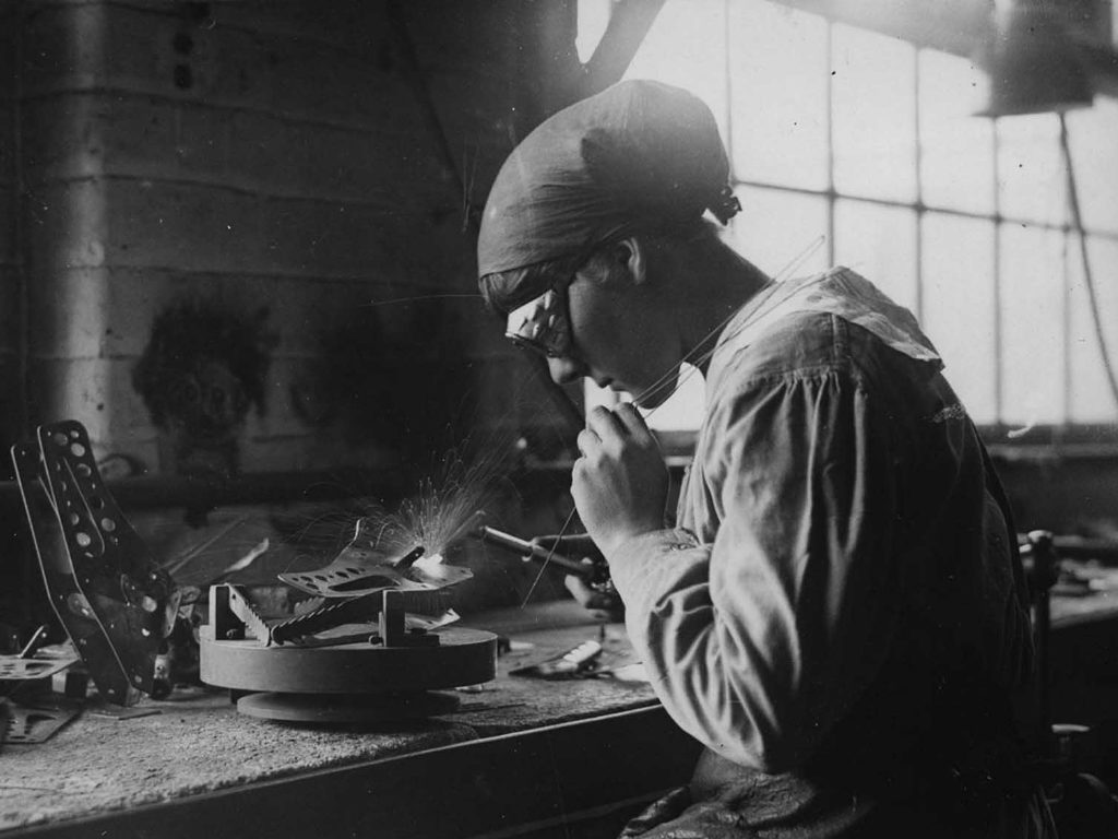 Finally, some protective goggles. Alas, these probably weren’t enough to fully protect the welder at the National Filling Factory in 1917 from sparks – notice her lack of gloves and fulll face mask. At least her hair is wrapped in a scarf to keep it out of harm’s way.