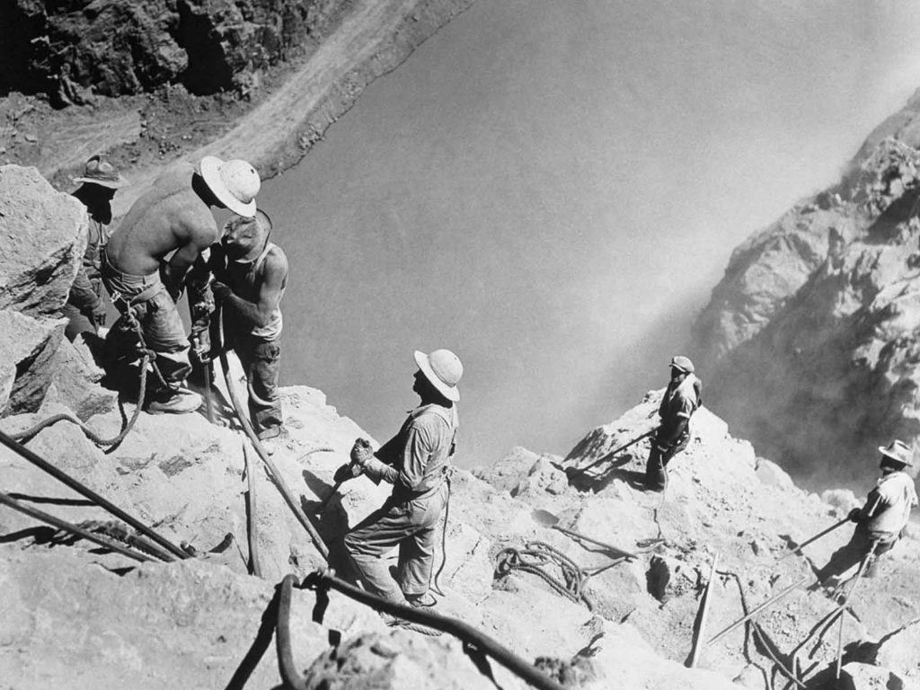 An excellent example of the kind of vertigo-inspiring work that was performed while constructing the Hoover Dam, this photo from 1935 shows “highscalers” using jackhammers to clear sections of rock from the side of the dam.