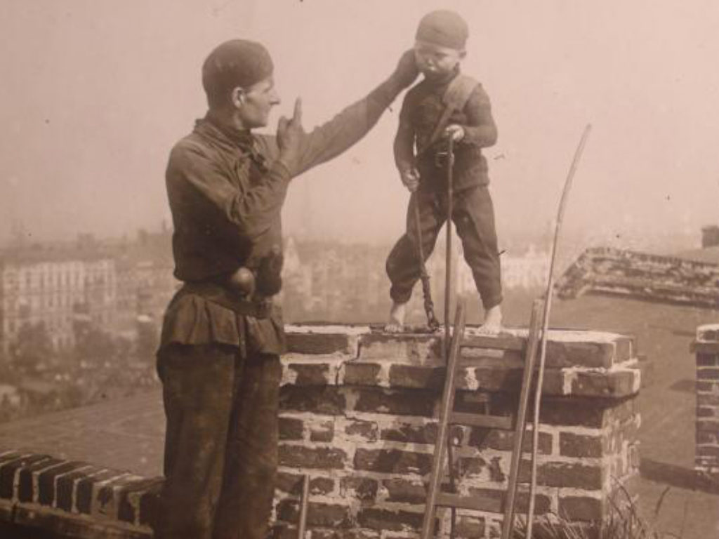 This photo of unknown origin shows a chimney mater alongside a young chimney sweep. “Mary Poppins” paints a very unrealistic portrait of sweeps – in 1775, scientist Percivall Pott first published a paper linking soot to scrotal cancer, but the practice of sending small sweeps up chimneys didn’t die off for another two hundred years. Turns out sweeps aren’t as lucky as lucky can be after all.