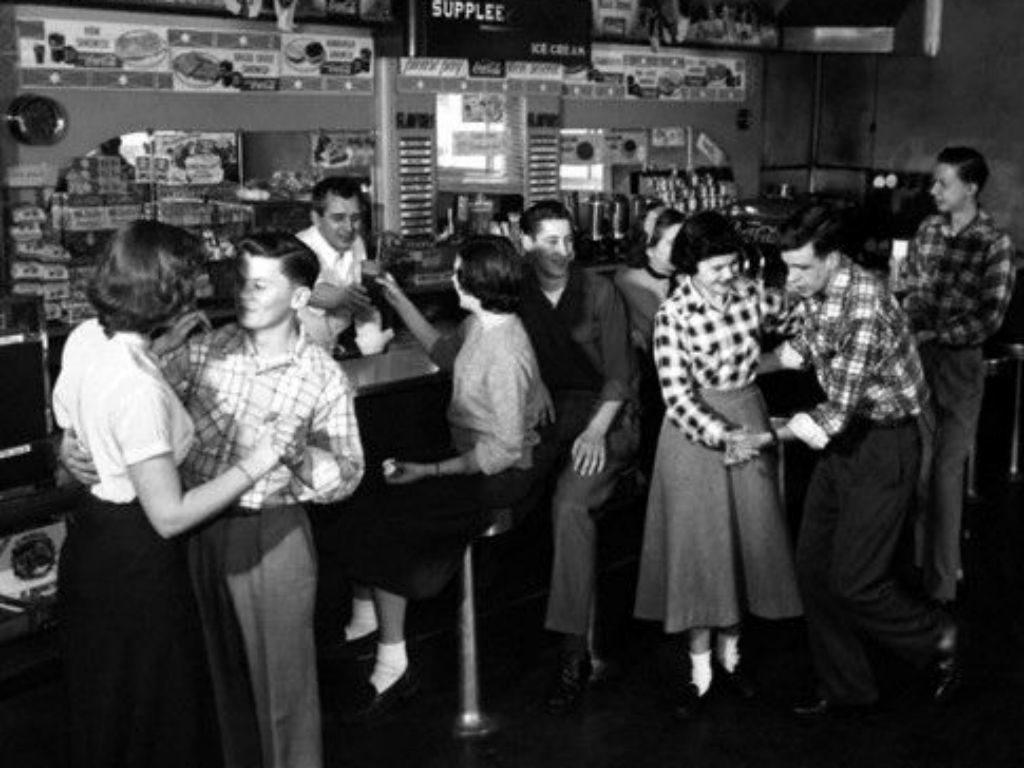 1950s soda shops: where teenagers hung out, danced, courted (hooked up) and drank soda. Ah, the innocence. There were no distracting iPhones while they socialized, so teenagers in the 50s actually had to talk to each other!